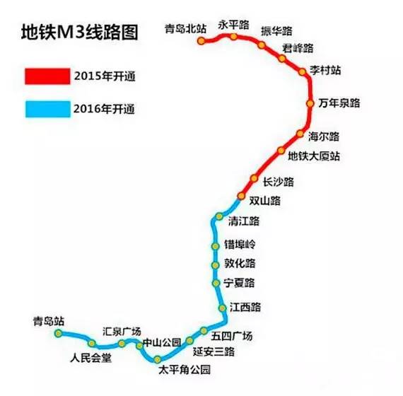 青岛地铁3号线途经市南区、市北区、李沧区, 沿途共设22站点,全长24.8千米,北段已于2015年12月16日正式开通试运营,南段计划2016年底开通。