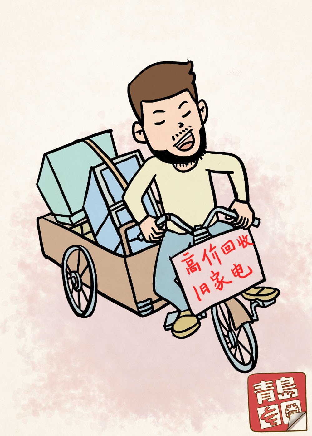 “来了收破烂咯... ...收旧冰箱、电视、洗衣机、电脑!” 虽然买不了几个钱,但总比扔了的好。dei ! dei ! dei!(对!)