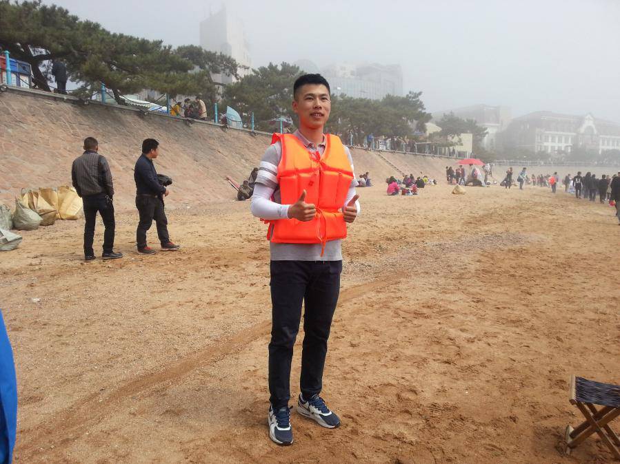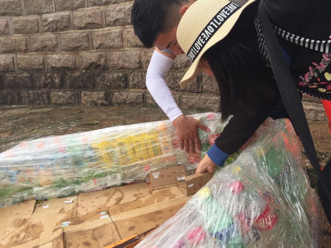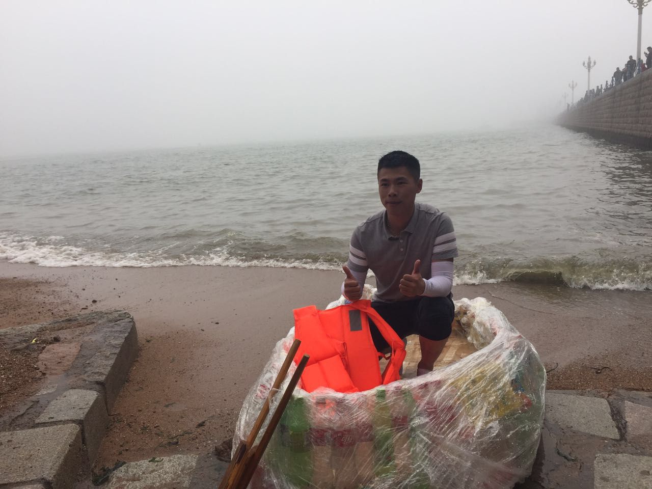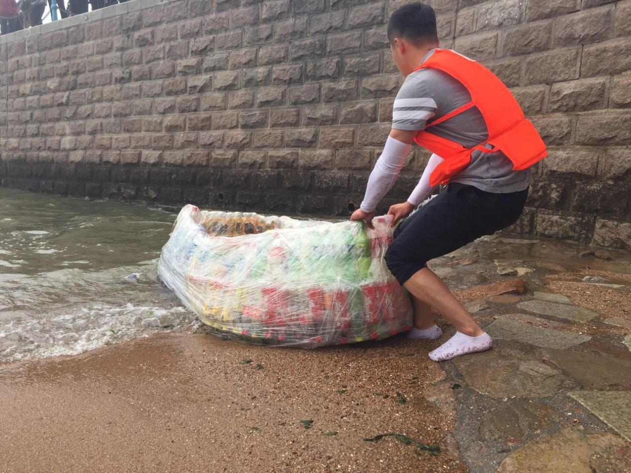 小编了解到,这位小伙叫刘佳祺,一直有一个航海梦,因受跑男节目勇渡长江的启发,决心完成这个梦想,用废旧瓶子自制一艘船,跨越胶州湾。刘佳祺介绍,自制的这艘船大约收集了500多个废旧瓶子,用胶带和保鲜膜固定船体。由于自学过航海专业知识,刘佳祺表示对此次航海非常有信心。
