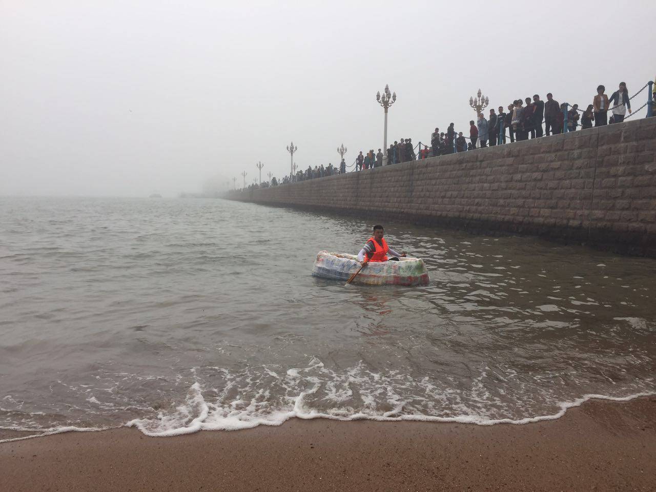 13日上午10时许,在青岛栈桥附近海边,一位年轻小伙的惊人举动,引起了众人的围观。小伙声称要用废旧瓶子自制小船横渡“胶州湾”,完成他的航海梦。