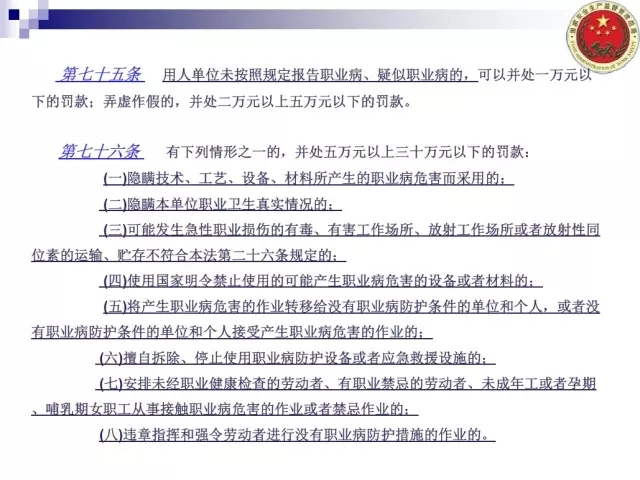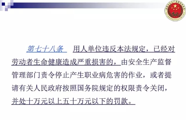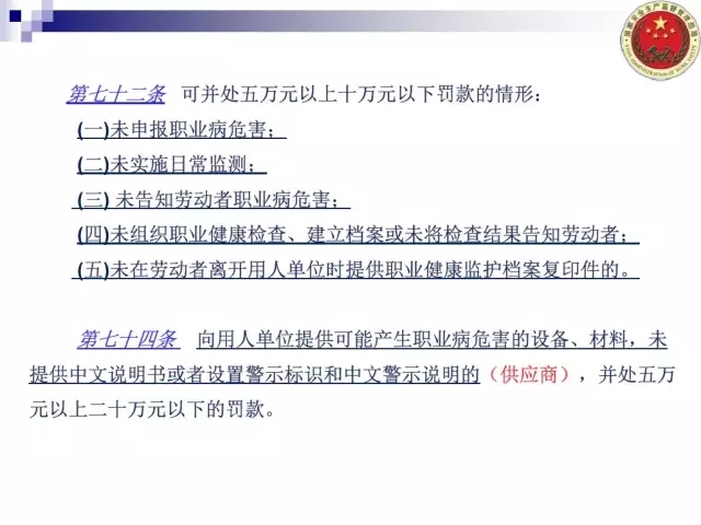 《职业病防治法》中对用人单位的要求有10条39项,其中有5条16项可以由基层执法人员直接并处罚款(直接并处罚款是指当已经确认企业存在违法行为,安监部门可以不给予整改时间,立即处罚)