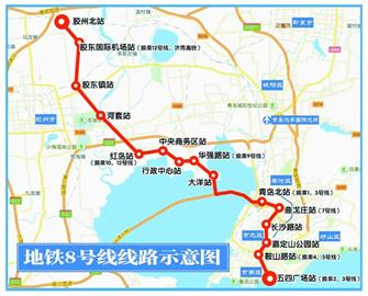 记者从青岛地铁集团了解到,青岛地铁8号线线路起自国铁胶州北站,经胶东国际机场、国铁红岛站、红岛CBD、东大洋,过海至青岛北站枢纽,然后经沧口机场沿周口路、南昌路、山东路至香港路五四广场站,串联了胶州市、高新区、李沧区、市北区、市南区;正线全长60.7公里,其中高架线6.55公里,过渡段0.53公里,地下线53.62公里;设车站16座,其中高架站1座,地下站15座;设有胶州北车辆基地,河套停车场和嘉定山公园停车场。