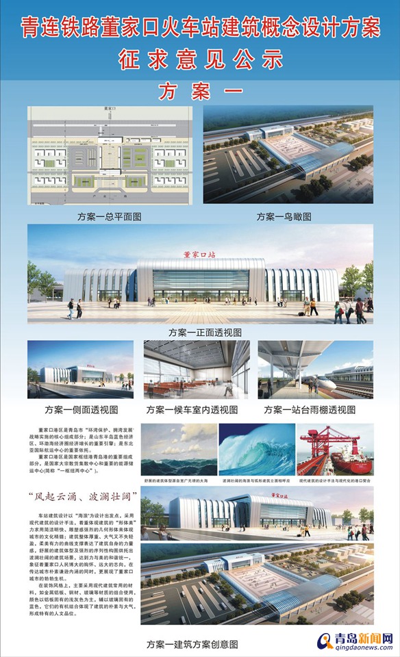 青岛新闻网日前从西海岸政务网了解到,青连铁路青岛西站和董家口站建筑概念设计方案目前已对外公示,现面向公众征求意见。