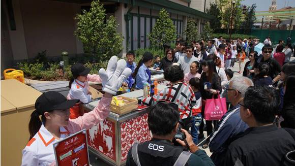 而位于米奇大街的米奇好伙伴美味集市(这里有许多特色的中式小吃,例如虾饺、叉烧包、烧麦之类的),同样是一家三口,他们点的东西似乎也好不到哪去: