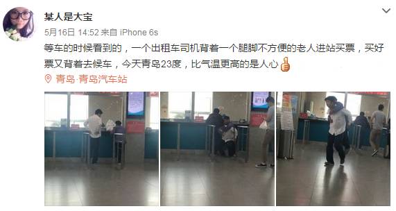 5月17日,记者联系上了发帖网友许女士。她告诉记者,她是在5月16日14时50分左右在青岛长途汽车总站无意中发现这一幕的。当时她提早买完车票,因未到发车时间就在售票大厅等候,这时,她看到一位男士背着一位老人进来买票。“根据他身穿的制服,推断背着老人的这个人是一位出租车司机。”许女士说,那位老人看起来年龄很大了,行动很不方便,随身还带着拐杖。那位司机师傅在帮老人买上车票后,又把老人背到了候车区安顿好才离开的。许女士回忆说:“在这个过程中,老人要给司机师傅钱,不过被司机师傅拒绝了。”