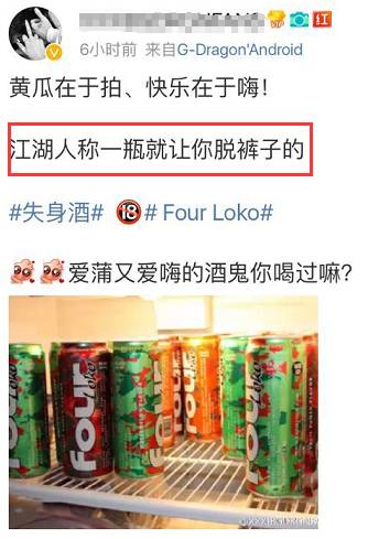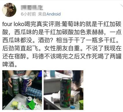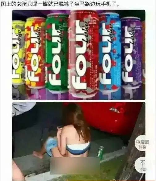 最近,微博上有一款酒精饮料Four Loko火起来了,最先爆料的网友@草莓馅儿虎称,“喝起来像果汁,但实际度数特别高,而且是后反劲的酒,圈内称失身酒”……据说酒量差的人喝一罐必断片。