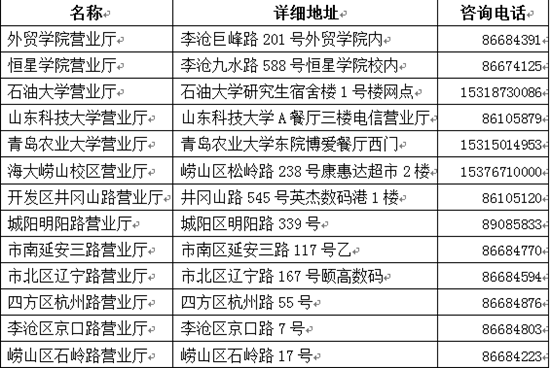 附2:电信受理手机琴岛通业务网点