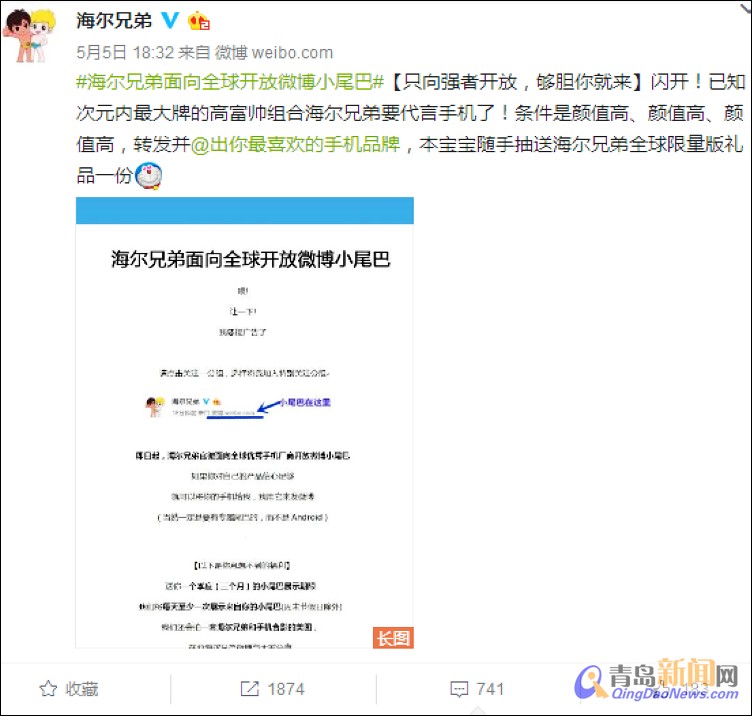 近日,海尔兄弟官方微博发送了一条“海尔兄弟面向全球优秀手机厂商开放微博小尾巴”的消息。该消息一经发出,就收到了来自微博网友和各大手机厂商上千条的转发和评论,积极“搭讪”并向海尔兄弟官微推荐手机品牌。昨日,魅族手机最终以压倒性优势折桂,成功“约上”海尔兄弟并成为其微博小尾巴。