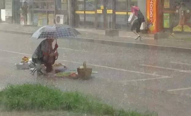 这样的天气明显已经不可能卖出多少蔬菜了,但是剩下的菜还有不少,突如其来的暴雨,让街道变得空旷,孤零零的父亲抱着孩子在卖菜的板车下躲雨。