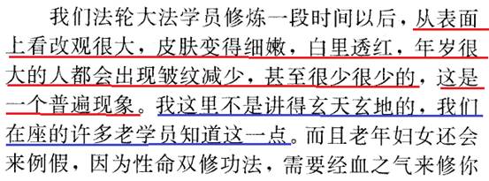 请注意,这是李大师在介绍“法轮大法的特点”。什么特点?说是“性命双修”,修命就是延长寿命,标志就是法轮功学员修炼一段时间以后,“从表面上看改观很大”,皮肤细嫩、皱纹很少,而且是普遍现象。大概说这话时底气不足,怕别人不信,又特别强调:“我这里不是讲的玄天玄地的,我们在座的许多老学员知道这一点。”