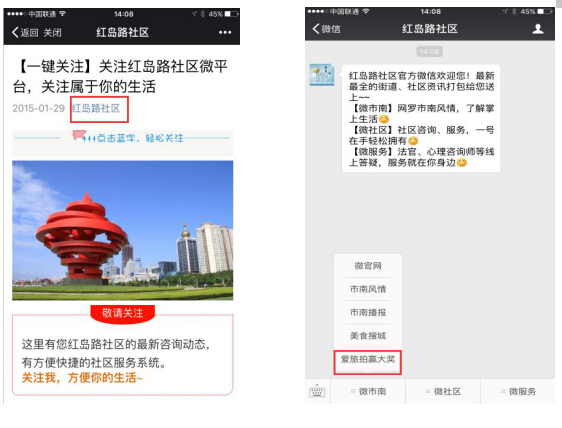 如果您居住在市南区请扫描二维码,选择并关注您所在的街道、社区,依次点击菜单“微市南”——“爱旅拍赢大奖”参与活动,其他地区请点击关注微市南,点击菜单“爱旅拍”参与活动。