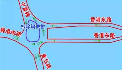 二期调流要拆除一期调流围挡(原钢便桥位置),扩大宁夏路西侧出入口围挡范围、围占联通门前现有调流路。香港中路与宁夏路(麦岛路)交叉口恢复4车道通行。工期为:7月8日至7月30日。