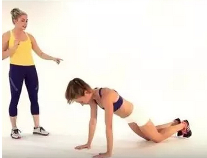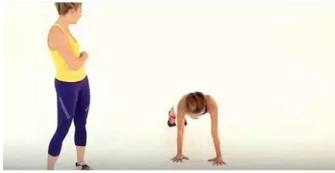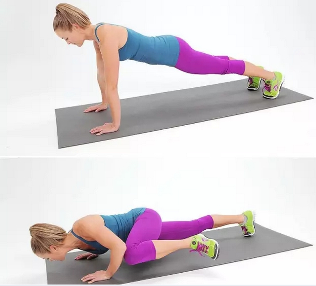 做撑臂姿势,肘部屈向两侧,压低身体,弯曲左膝使之触到左肘,手臂伸直,双脚并拢,回到撑臂姿势,身体再次压低,右膝触到右肘,恢复撑臂姿势。锻炼结束后加3组该动作,每组10-12个。