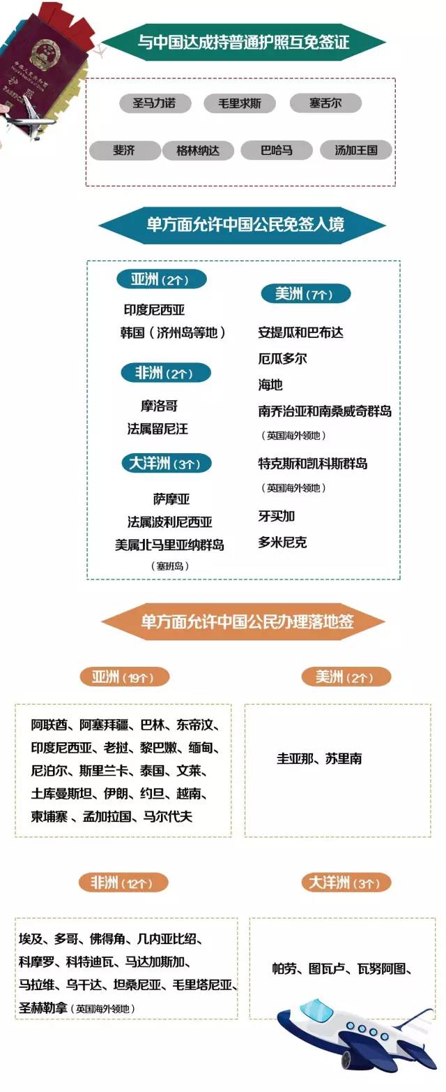 对持普通护照的中国公民免签/落地签国家和地区