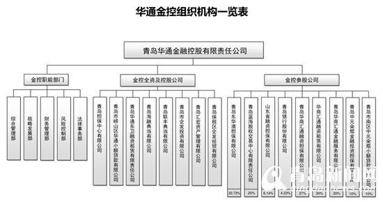 青岛华通金融控股有限责任公司成立于2015年,注册资本12亿元,是青岛华通国有资本运营(集团)有限责任公司旗下的专业投资管理机构,专注于融资担保、小额贷款、融资租赁、典当等综合性金融及金融服务机构的投资与运营。公司控股青岛担保中心有限公司、青岛市崂山区华通小额贷款有限公司、青岛华通东卫融资租赁有限责任公司、青岛海融典当有限公司等企业8家,参股青岛银行股份有限公司、山东省融资担保有限公司、青岛蓝海股权交易中心有限责任公司等企业9家。