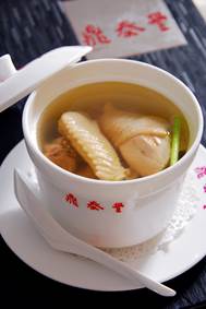 鸡汤清澄鲜美却不油腻,堪称一绝。鸡汤的选材也不普通,尝试了各地的鸡肉,最后选中的是一种天然放养鸡。由两块动肉即腿肉、翅肉和两块不动肉即胸肉、背肉经过6道严谨工序后,组合单独成盅,蒸炖6小时而成。