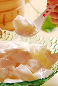 玉脂是鼎泰丰给自制杏仁豆腐的爱称,一看“自制”便知决不同于常见的淀粉色素加香精。北杏浓香但味苦,南杏虽甜但香气不足,将两种杏按最佳比例搭配,去皮、磨粉、打熬才有了这样香甜的玉脂。杏仁豆腐制成打熬是关键,不仅需要技术、经验、功夫还要体力!在鼎泰丰熬制杏仁豆腐的师傅都超壮,每天早上是师傅体力最充足的时候,还要两人轮流!每天打熬的杏仁豆腐都是最新鲜的。