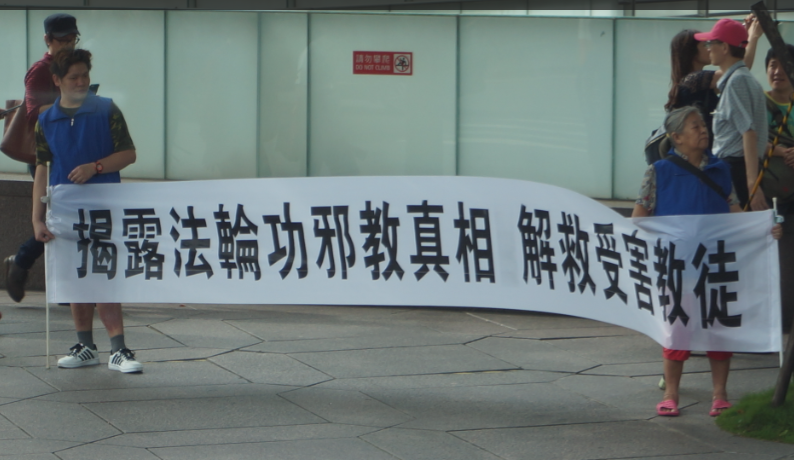 横幅“神棍李洪志编造邪法愚弄台湾民众”