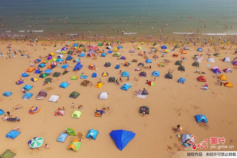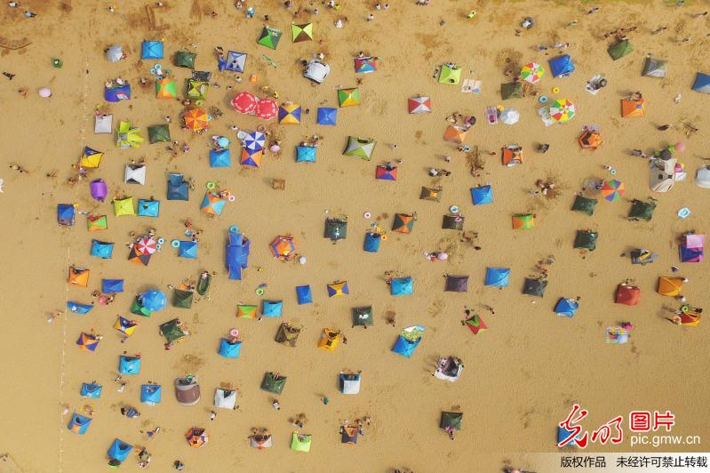 今年允许私人搭建帐篷,从海滩上分出几处帐篷区域,在航拍视角下,一幢幢色彩鲜艳的帐篷如卡通城堡,点缀在海滩上形成一道靓丽的风景。