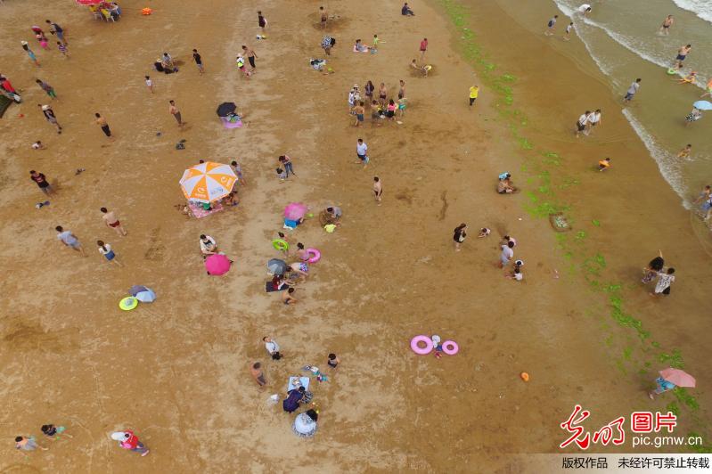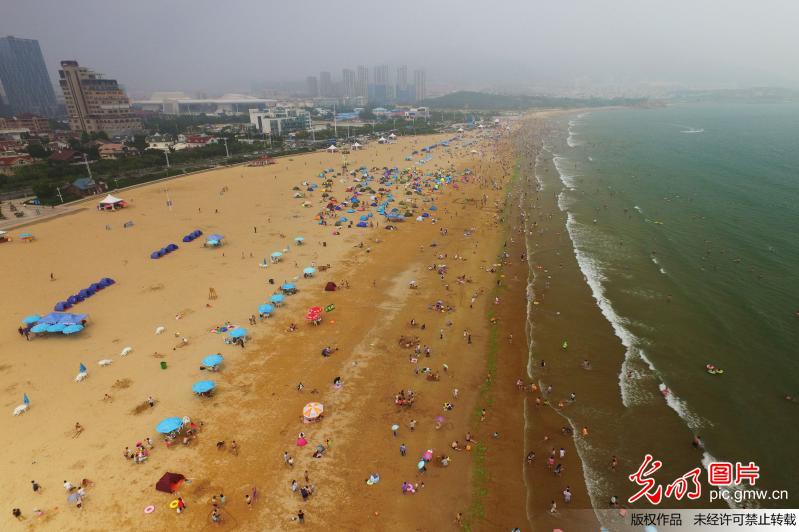 2016年7月3日,航拍青岛石老人海水浴场,游客在海滩上度假冲凉。