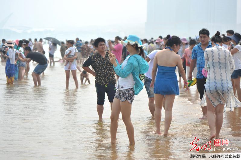 2016年7月3日,青岛石老人海水浴场游人如织,图为游客在海滩上拍照嬉戏。