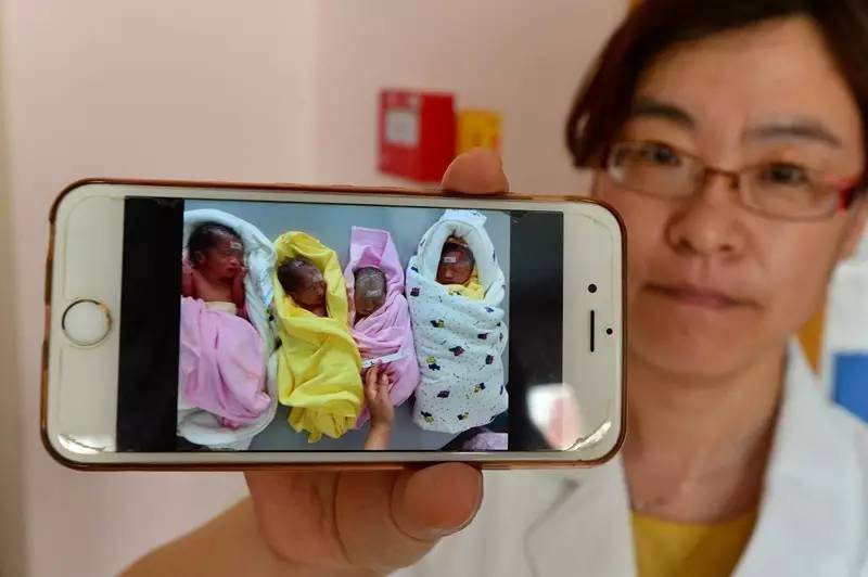 大夫展示刚出生的四胞胎照片