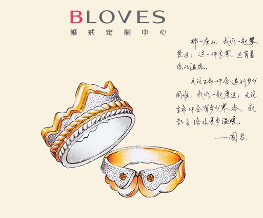 听说在青岛,你们的爱情故事都伴着海风的味道!所以BLOVES带着好奇心不远万里爬山涉水而来,只为与你促膝而谈,聆听你们的爱情故事,让它触动心弦,把它点滴的浪漫与深情凝聚到指尖上的婚戒。中国婚戒定制开创及领导品牌BLOVES婚戒定制中心以“情感定制”为设计理念,专注定制有爱情故事的婚戒,崇尚坚守“爱不仅是誓言、更要用心行动”的爱情观。