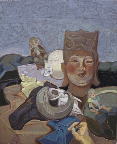 古光辉面对物象时意欲描绘它们的形貌,但潜意识却总要探触隐藏在物象表面之后的精神性的东西,具象在他的作品中占有中心的位置,支配这种语言倾向的是他平和,理智的心理状态。画作和现实物象又拉开了距离,正如他自己所说:“迷恋传统的同时,也在寻找现代感”。线在他的画作中也经常出现,这是只有性情内倾和视点专一的人对线条又特别的倾心,因为线条比明暗更实在,更冷静,更有抽象意味,在造型上也更充实饱满。