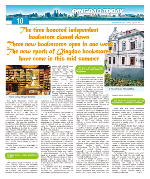 In 2009, Zhang Binglin didn’t just run bookstores but became the trailblazer to introduce coffee and cultural activities into bookstores. He used to manage 4 bookstores and 1 coffee company at the same time. About the future mode and direction of bookstores, Zhang Binglin, who is a romantic person, is still at loss. But we know that no matter it relies on capital or romanticism, a more balanced pattern of Qingdao bookstore industry will emerge in the future with deep impressive impact on daily lives of Qingdao people.