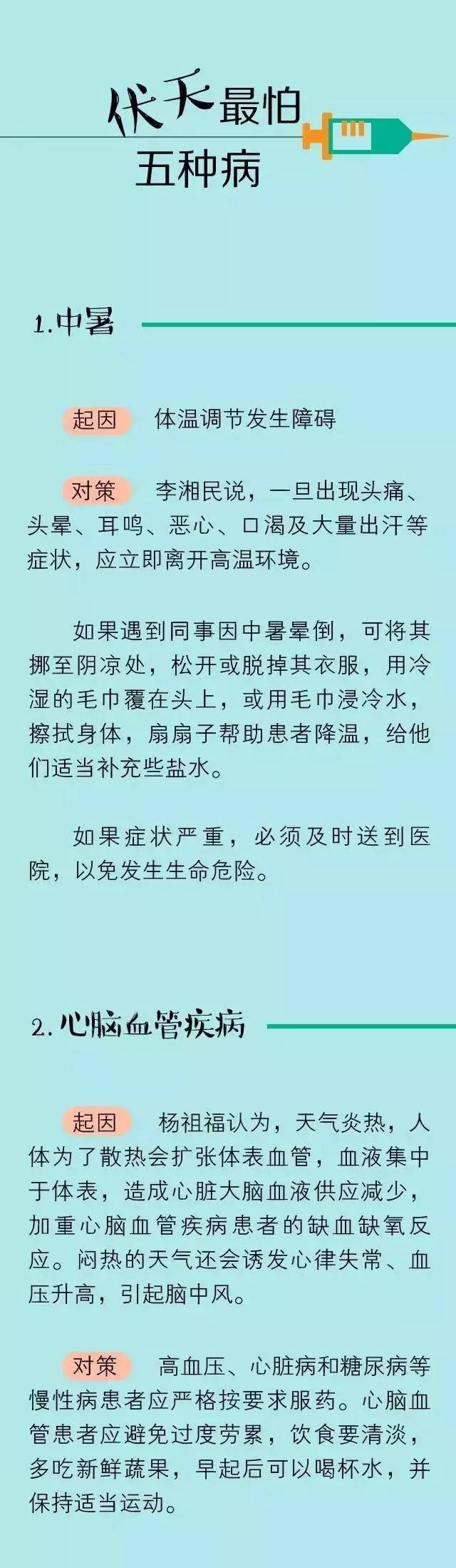 随着气温节节攀高,中暑、空调病、肠道疾病等各种健康问题也接踵而来,怎样才能躲开伏天的这些病?记者采访了中国康复研究中心北京博爱医院心内科主任医师杨祖福、中南大学湘雅医院急诊科副主任李湘民等专家,教你一套伏天的养生法则。
