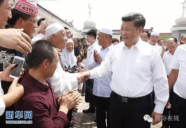这是7月19日上午,习近平在银川市新城清真寺同宁夏伊斯兰教界人士交流。新华社记者鞠鹏摄