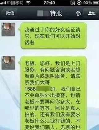 骗子把微信演变成诈骗平台,以提供“招嫖”、“特殊服务”为幌子,利用美女照片作为微信头像,对一些空虚寂寞之人趁机下手。
