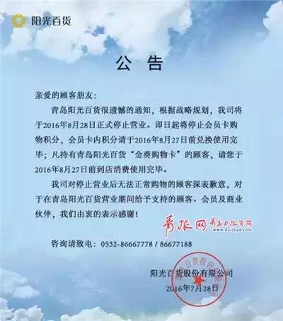 阳光百货官方微信、微博于7月28日公告称,根据战略规划,阳光百货将于8月28日起正式停止营业。即日起将停止会员卡购物积分,会员卡内积分请于2016年8月27日前兑换使用完毕;凡持有青岛阳光百货“金葵购物卡”的顾客,应于8月27日前到店消费使用完毕。