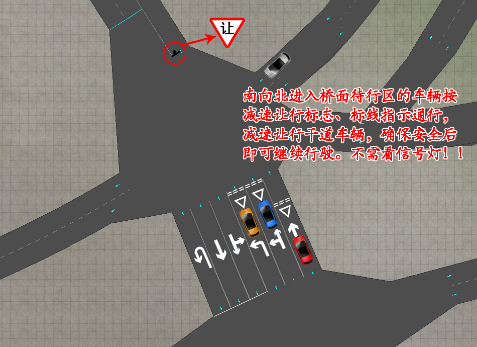 桥面南向北车辆待行区施划的是减速让行标线,好多驾驶员将它和 停车线同样看待,误把高架路专用信号灯当做待行区信号灯,经常会停在待行区内等红灯而不敢通行,导致车辆排队过长、路口堵死。