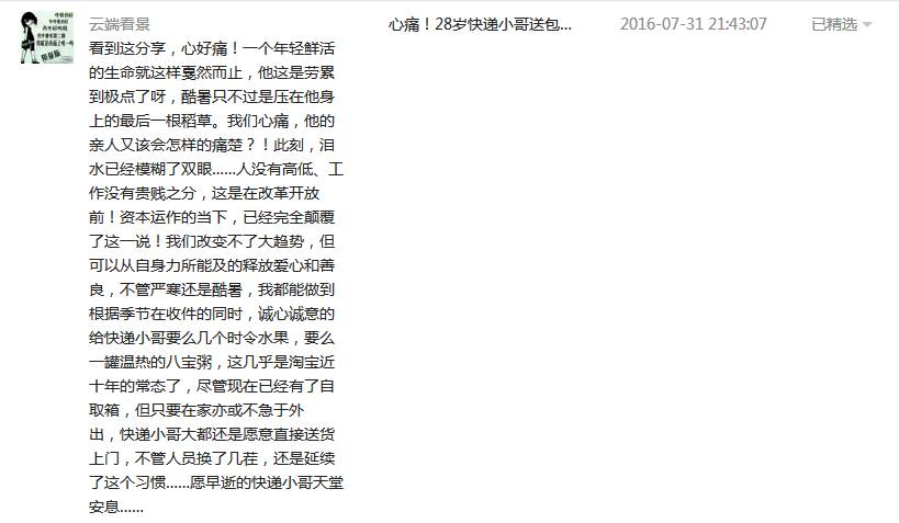 昨日获奖者为《心痛!28岁快递小哥送包裹时中暑身亡!请善待烈日下为我们奔波的兄弟! 》中的评论者: