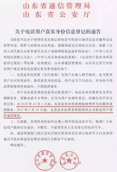 ▼▼▼【重要提醒】根据山东省通信管理局、山东省公安厅联合下发通告要求,自 2016年10月1日起对未实名制登记的客户陆续暂停通信服务,2017年6月30日前,将陆续终止为前述用户提供通信服务。请未办理实名制登记的用户尽快持本人身份证和手机卡到就近的移动营业厅或代理网点办理实名登记,逾期未办理的,我公司将依据上述规定暂停提供通信服务直至终止服务。如您已办理请忽略此短信。
