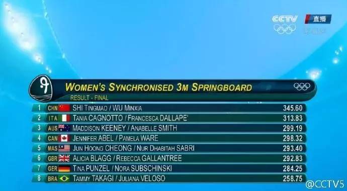 跳水女子双人三米板决赛中,中国组合施廷懋/吴敏霞以总分345.60分的高分轻松折桂,吴敏霞个人在该项目上实现四连冠。此外,这也标志着 吴敏霞超越前辈伏明霞和郭晶晶,以5金1银1铜的成绩成为奥运女子跳水第一人,同时还成为继邹凯之后,中国奥运史上第二位“五金王”。