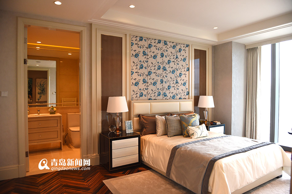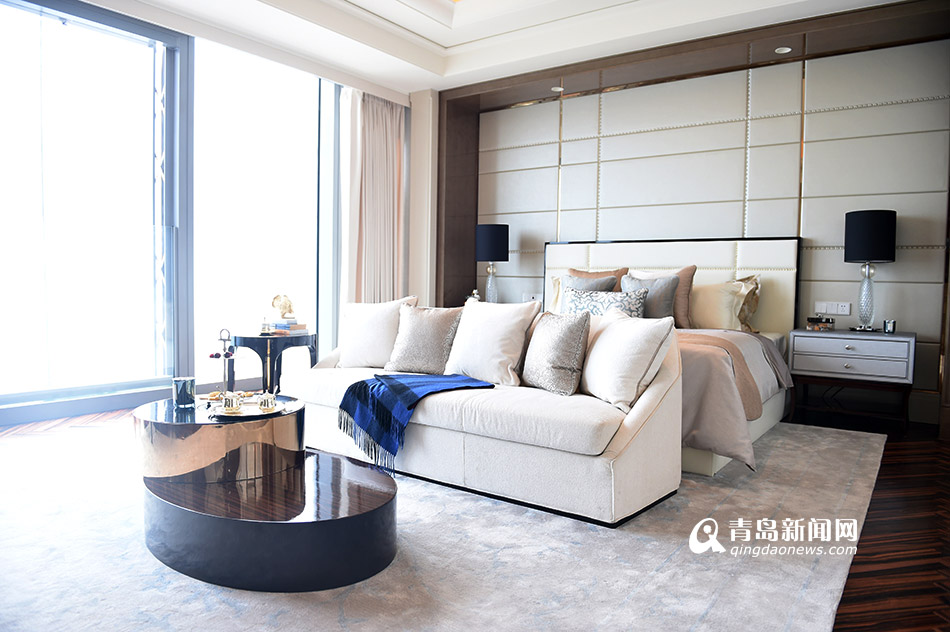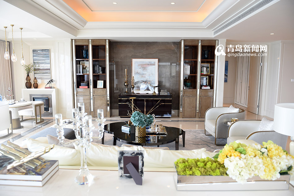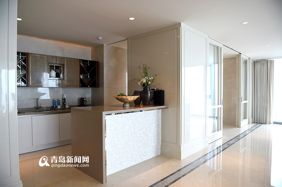 日前,位于青岛东海西路上的一处高端住宅样板房向媒体开放,青岛新闻网记者走进这处位于30层高楼上的海景豪宅参观体验。这处豪宅面积达到了460平方米,有6间卧室,两个大厅,两个厨房和5个洗手间,还有堪称奢华的吧台和衣帽间。房子在装修上以白色调为主,风格偏向欧美风,简约中不失高贵典雅的气质。