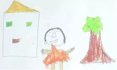 一个小学生画的。人头大,是孩子画的特点,使用了黄色和橘色这两种暖色调,说明孩子感觉到很温暖的状态。房子的门没有接地,说明孩子可能与家人、或同伴,在交流上有点困难。门有点像红色嘴巴,说明孩子平时沟通中,有着比较激烈的言语模式。