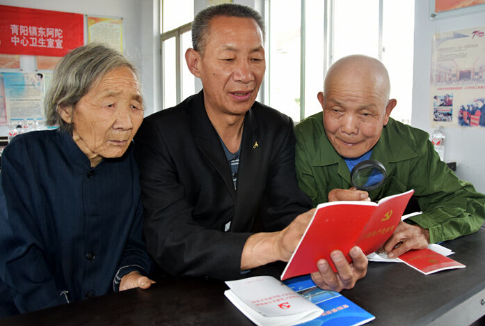 青阳镇东阿陀村党员赵德连(中)一家利用党员民主议政日时间学习党章。赵德连2002年入党,父亲赵建增(右一)1990年入党,母亲靖秀英(左一)1958年入党,三人的党龄加起来有98年。