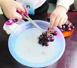 然后,将葡萄放进清水盆中,水量没过葡萄,加入1~2勺面粉,和水混合均匀,静置2分钟,用手拎着葡萄梗,在水中轻轻摆动,让面粉和附着在葡萄果实之间的杂质充分触。