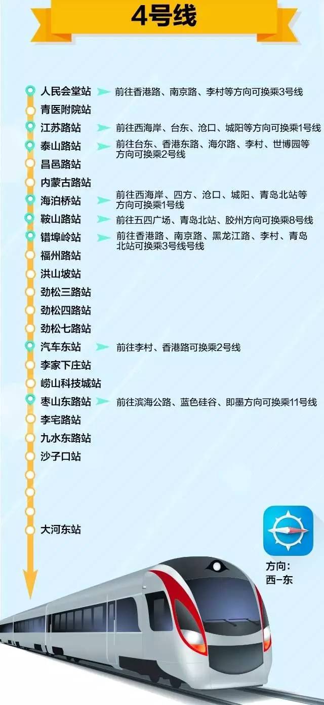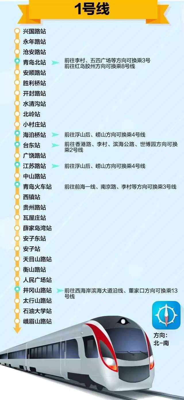 地铁1号线设40座车站,其中换乘车站达6座,起点李沧兴国路终点西海岸峨眉山路站,连接了青岛火车站、青岛北站、汽车北站等重要交通枢纽, 是一条南北大动脉!