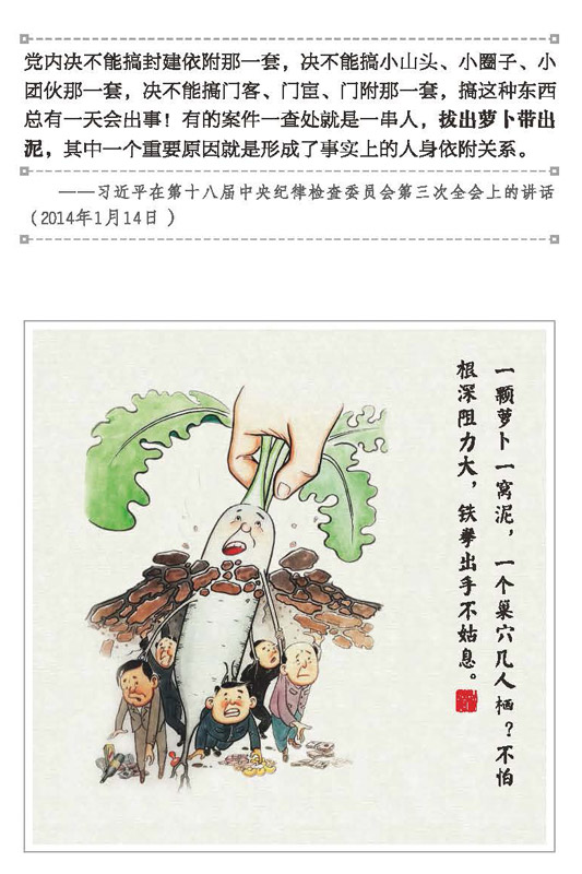 妙语如珠巧解读。《清风漫笔》配以通俗易懂、诙谐幽默的诗词对每幅漫画进行解读,如“拜我山头,此后富贵不愁;做我门徒,自有光明前途”“尚未扶贫先扶瓶,看似为民实为名”,这些看似简单的诗句不仅是对漫画的深刻注脚,更是对违纪违法行为入木三分的刻画,让党员干部知“分寸”、守“底线”。