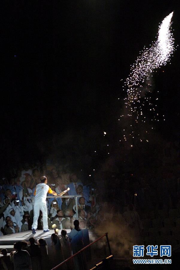 图为2004年9月17日,在雅典残奥会开幕式上,最后一棒火炬手、残疾人运动员乔治斯·托普西斯点燃引信,一条“火龙”朝着主火炬台奔去,最终点燃圣火。新华社发