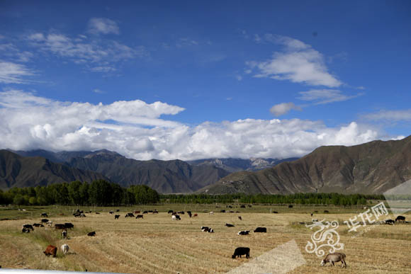 车辆行驶在墨竹工卡至拉萨的高速路上,窗外蓝天白云,牛羊成群。 特派记者 李文科 摄