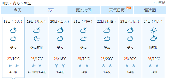 据市气象台预报,青岛今天东北风3到4级转4到5级阵风7级,最高气温27℃,最低气温19℃。