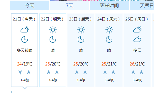 青岛市气象台21日06时发布最新气象信息,青岛市今天白天多云,北风转南风3到4级,今天夜间多云转晴,南风3到4级,今天的最高气温24℃,最低气温19℃,相对湿度50-80%。