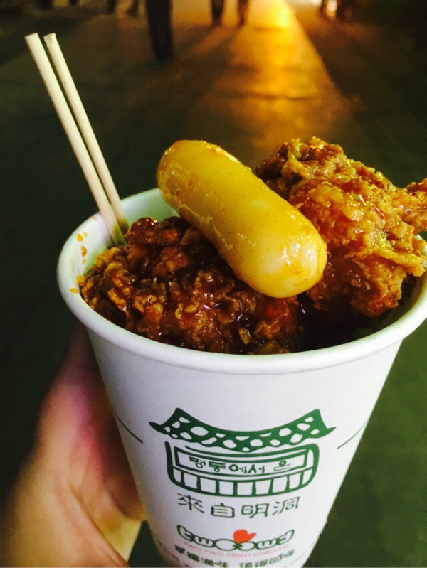 各种特色韩国小食。炸鸡都有8种口味。琥珀裹酱是蒜香微辣的、火焰裹酱(正常辣)、劲辣裹酱、经典裹酱(蜂蜜芥末味)、香酥原味、菠萝味、蜜桔味、芝士年糕味。