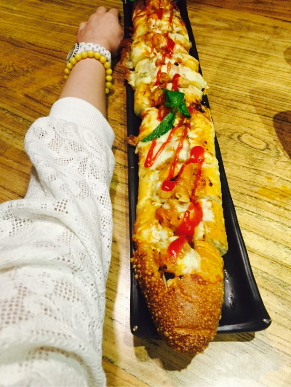 菜名也走不同寻常的道路。不一样的宫保鸡:鸡肉夹在烤的酥脆的法棍里,淋了芝士和番茄酱,吃起来像披萨,很有创意,几乎每桌必点。来自星星的你:其实就是草莓炒星星形状的年糕,但是真的很讨喜,口味酸甜。