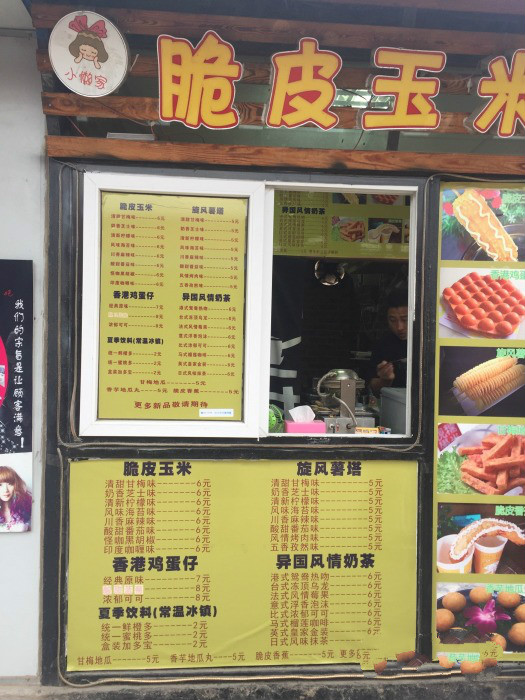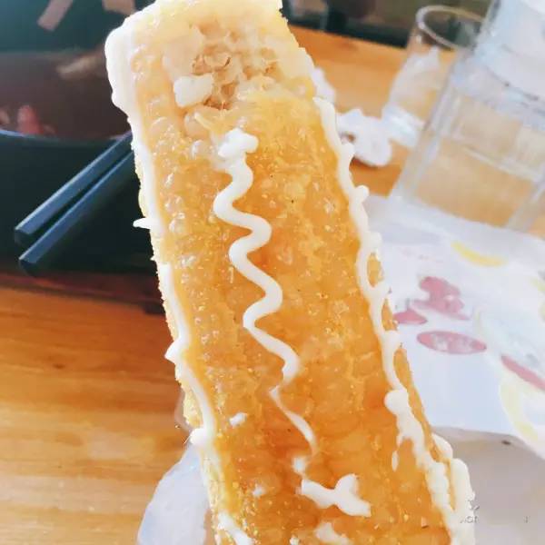 脆皮玉米芝士味的口感不错,有很多酱料可以选,鸡蛋仔味道也还好。